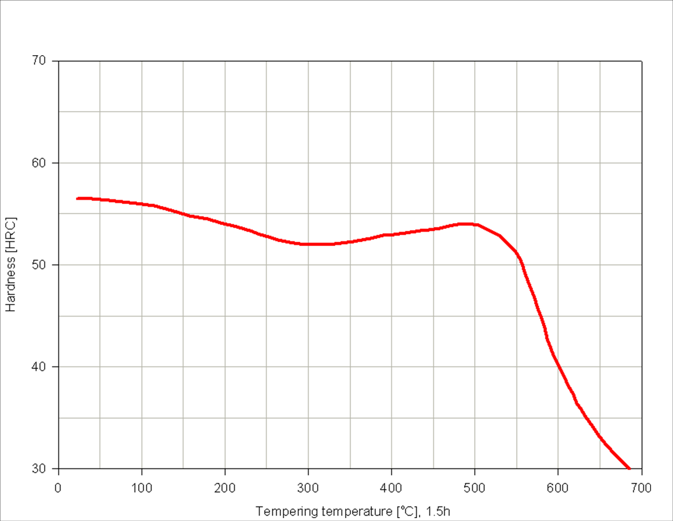 Harden from a temperature of 1000-1050oC followed by oil quenching. Hardness after quenching is 56 HRC.